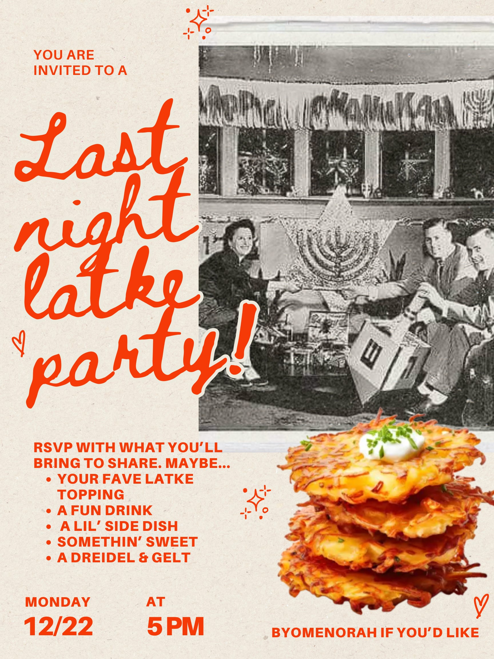 Hanukkah proceeded for me in hazy loneliness. Before the massacre, S made a WhatsApp group called “Hanukkah schemes” to divvy up the nights amongst our dwindling circle of Jewish friends splintered in the aftermath of October 7th. I didn’t want to host anything, but G nudged me into it. Second night, sixth night, and seventh night were snagged fast, and together, (and this is important), we decided I would host the last night – Monday. The first and the last are the holiest and I was honored to be “chosen” in a sense. I even made a cute little invitation.