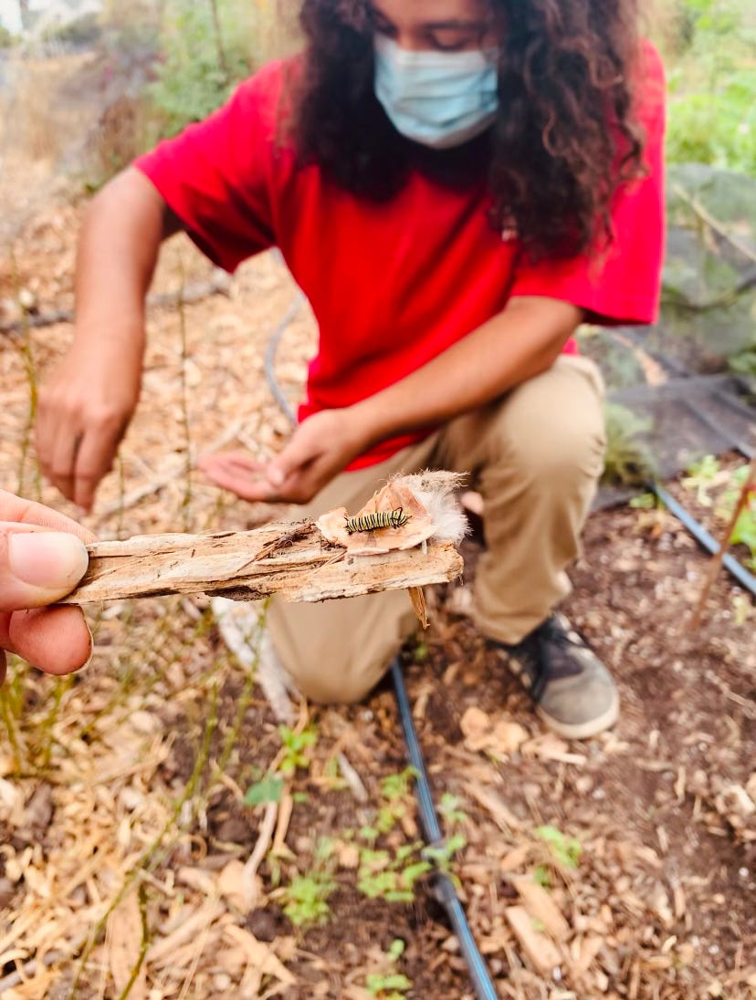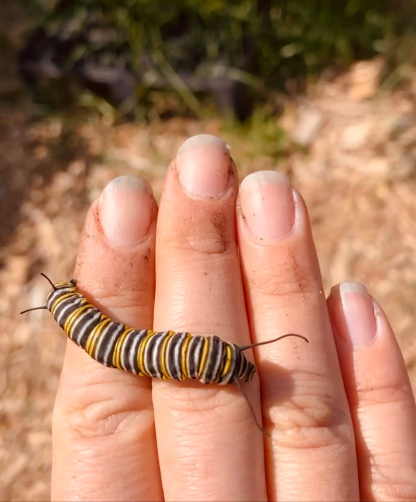 If the rush requires us to ignore, then the slow stretching of time invites us into awareness. The pandemic has blurred days into weeks into months, but look at how much more we can see now? I find myself on geologic time, on Earth time. I watch as the lemon beside me lingers in a deep green for what feels like eternity, until, suddenly, a blush of soft yellow emerges then spreads slowly, so slowly, into sunshine ready to eat. Moving slow and low one day also helped rescue hundreds of monarch caterpillars that had somehow found themselves on one far off milkweed plant they had voraciously chewed to stems. Without another food source nearby, all of them would have starved. It was only because we noticed some caterpillars lost in the lettuce rows, striving toward life, that we started to wonder. We picked them up one by one, tracing a trail of caterpillar “bread crumbs” to the sugar supply. We collected caterpillars as tiny as grains of rice and carried them over to the milkweed oasis across the farm.